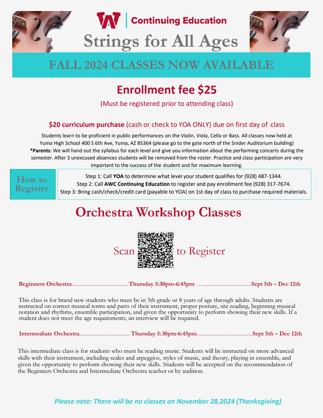 The Orchestra "Strings for all Ages" session at Yuma High School is held on Thursday evenings from 5:30 pm - 6:45 pm. It is divided into 3 levels of playing expertise. Call Janet Jones at (928) 246-6715 for information.